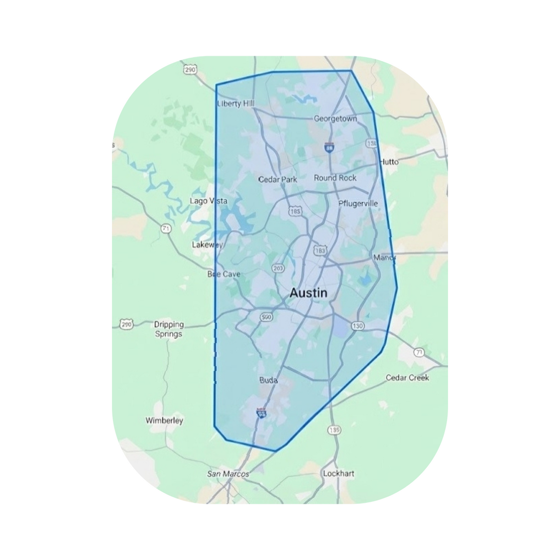 Austin • Bee Cave • Buda • Cedar Park • Georgetown • Lago Vista • Lakeway • Leander • Liberty Hill • Manor • Pflugerville • Round Rock
